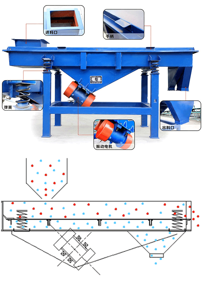 直線振動篩是雙振動電機驅動,當兩臺振動電機做同步、反向旋轉時使用振動篩需要注意哪些細節呢?看這兒,其偏心塊所產生的激振力在平行于電機軸線的方向相互抵消,在垂直于電機軸的方向疊為一合力,因此直線篩的運行軌跡為一直線。兩電機軸相對篩面有一傾角,在激振力和物料自重力的合力作用下,物料在篩面上被拋起跳躍式向前作直線運動,從而達到對物料進行篩選和分級的目的。