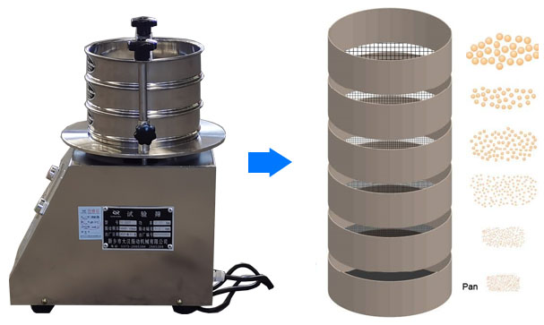 電磁試驗采用電磁振動器作為振動源,電磁振動器的振動帶動篩機低位振動,再通過底座傳遞到底座上由粗到細排列的一組標準試驗篩,同時安裝在下部的振動電機(或往復機構)將物料精選篩分,物料在標準檢驗篩的篩面上振動,使小于篩網孔徑的物料顆粒篩入下層檢驗篩,層層篩分,只有試驗篩的每一層都留有相同的粒徑,以達到不同的粒徑分離。