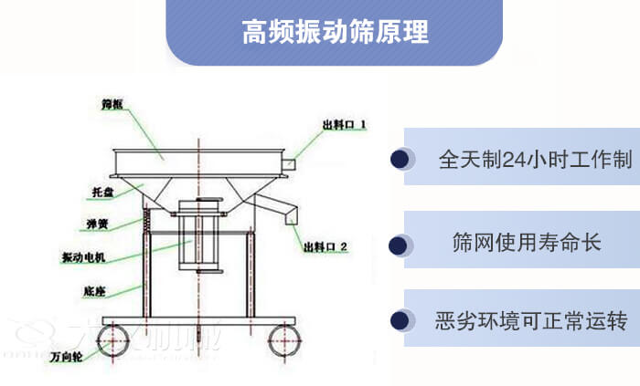 高頻振動(dòng)篩又稱(chēng)高頻過(guò)濾篩,結(jié)構(gòu)簡(jiǎn)單、體積小、具有高頻率,低耗能的特點(diǎn)